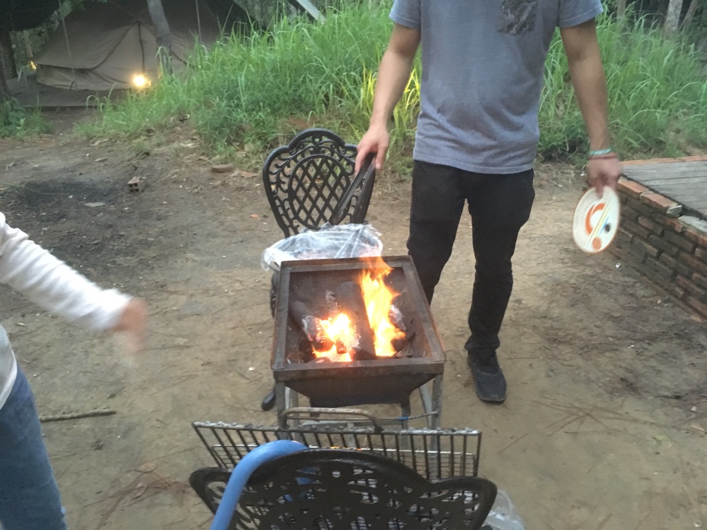 夕方暗くなるころから子供たちとベルテントでBBQ。火起こししたり焼き鳥食べたり。