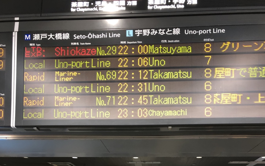 宇野みなと線かしら?8番ホームで高松行くけど・・・同じホームから松山行きも出てるぞ。これ乗っちゃったら大変なことになるなー