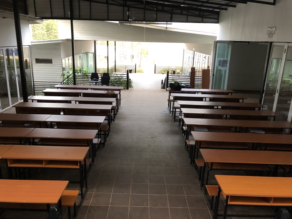 100人なので大型テントを使うと思ったら、他のイベントがあるようで、校舎の間にある廊下をつかうことになった。100人が半屋外で受講することになるわけだ。